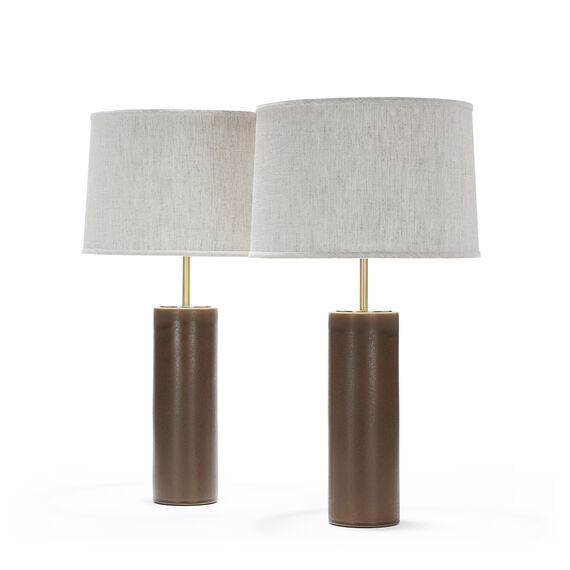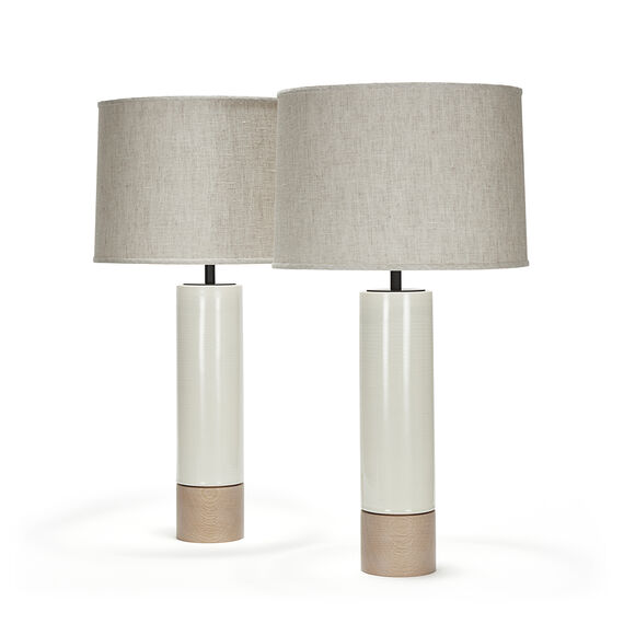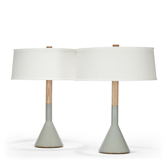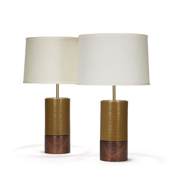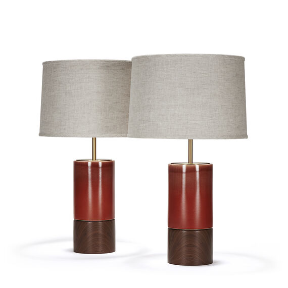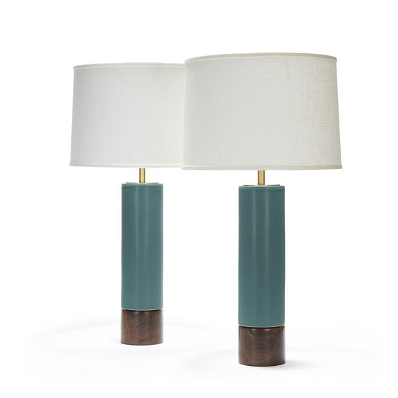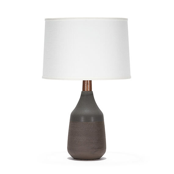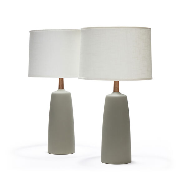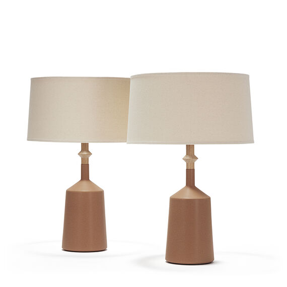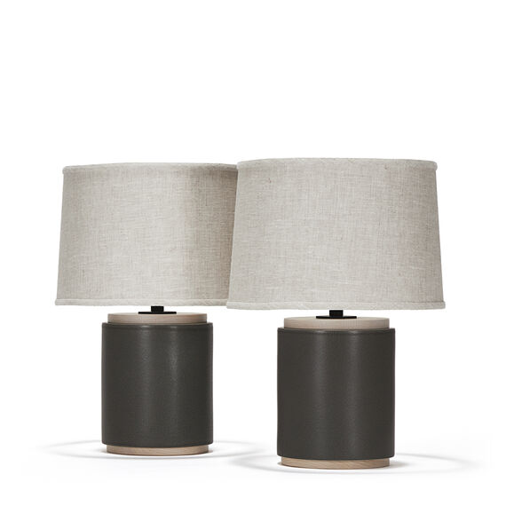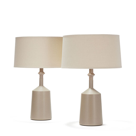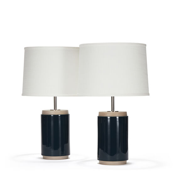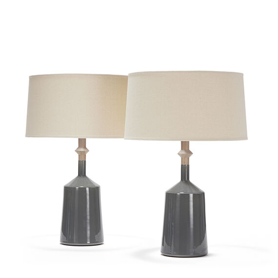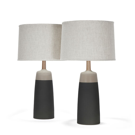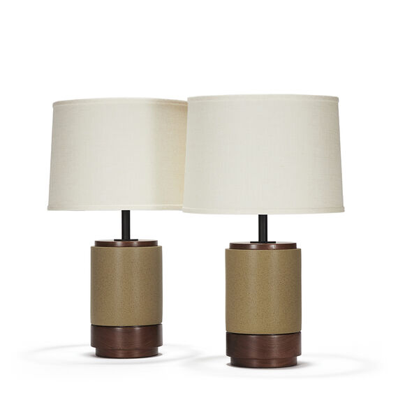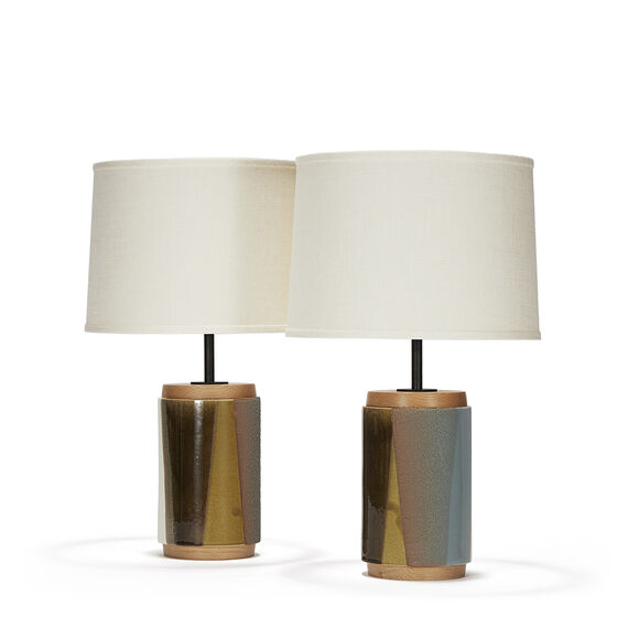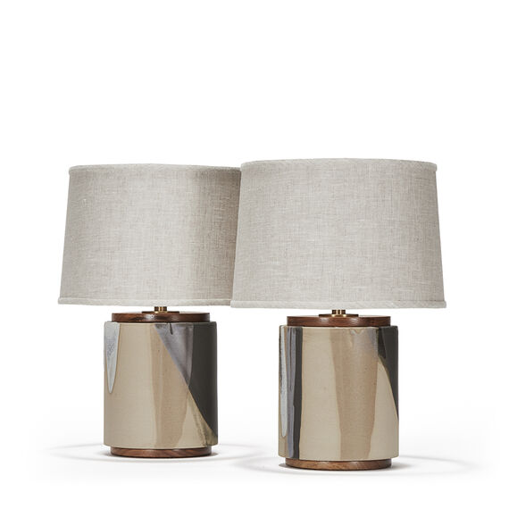 We handcraft each of our stoneware ceramic table lamps in our Upstate New York studio. All are UL Listed. Some ready-to-ship lamps feature custom glazes, surface treatments, wood finishes and shade fabrics not found in our Made-to-Order collection. We can recreate most of these custom finishes. If a lamp or lamps you like are marked "on hold" or have disappeared from this page (which means they've sold and can be viewed in Past Work), contact us with questions or quote requests for a new order at info@stoneandsawyer.com.