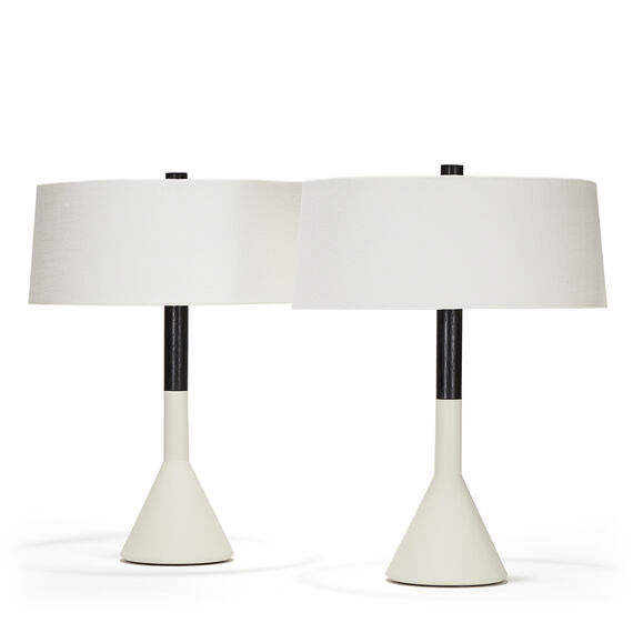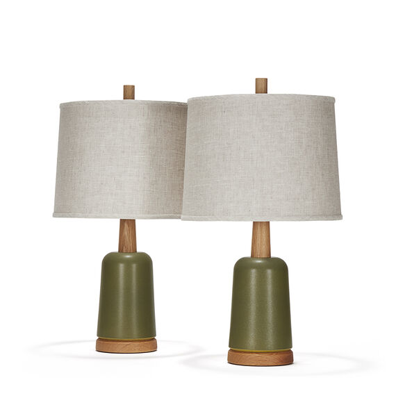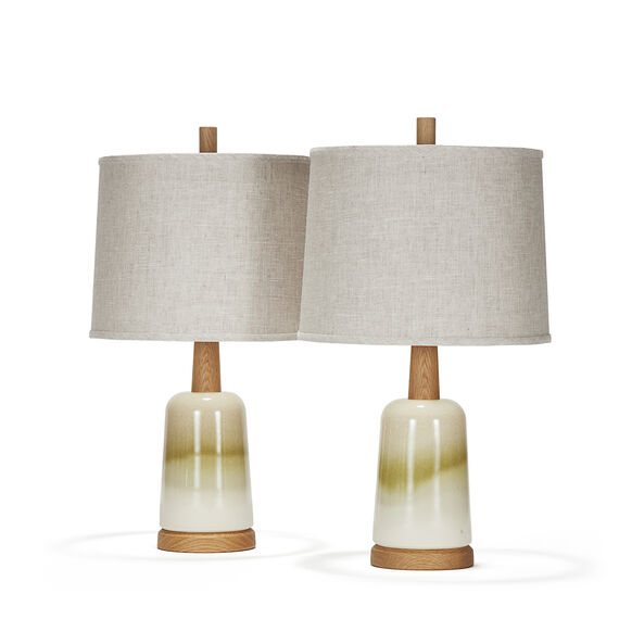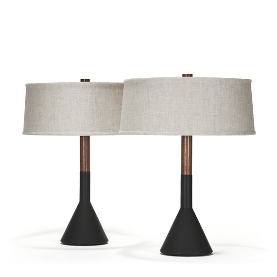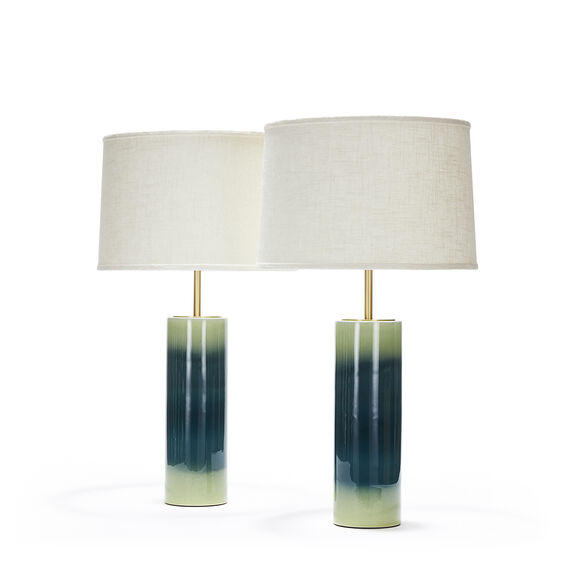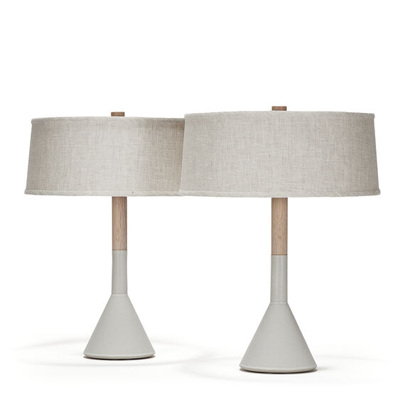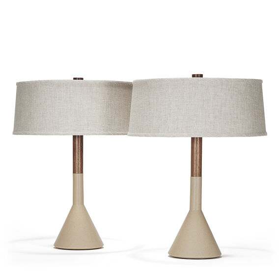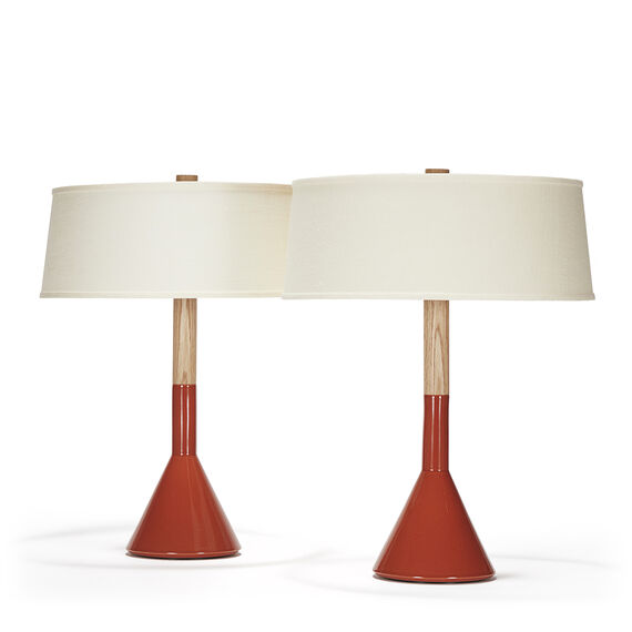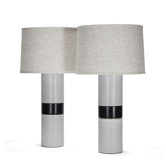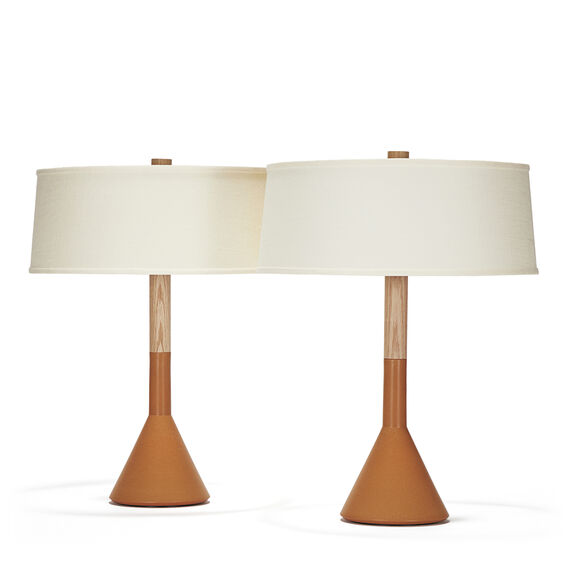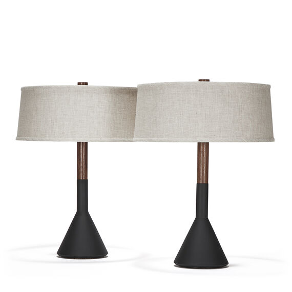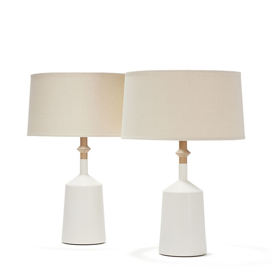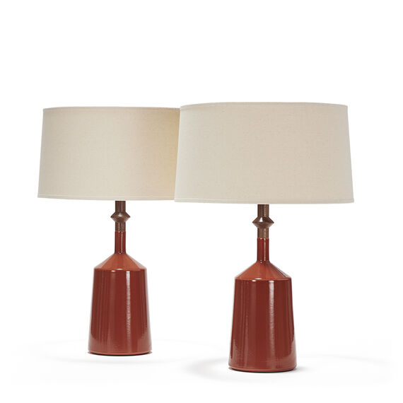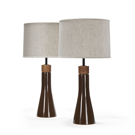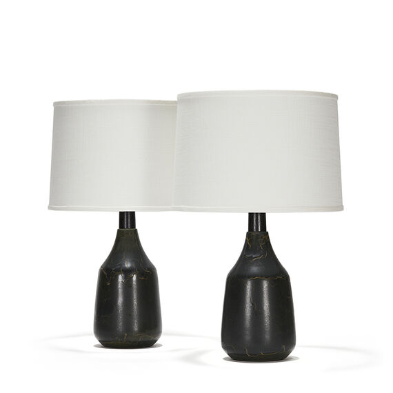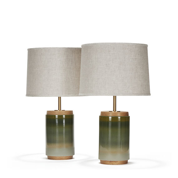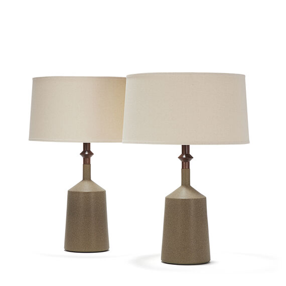 We handcraft each of our stoneware ceramic table lamps in our Upstate New York studio. All are UL Listed. Some ready-to-ship lamps feature custom glazes, surface treatments, wood finishes and shade fabrics not found in our Made-to-Order collection. We can recreate most of these custom finishes. If a lamp or lamps you like are marked "on hold" or have disappeared from this page (which means they've sold and can be viewed in Past Work), contact us with questions or quote requests for a new order at info@stoneandsawyer.com.