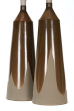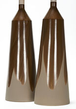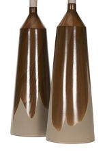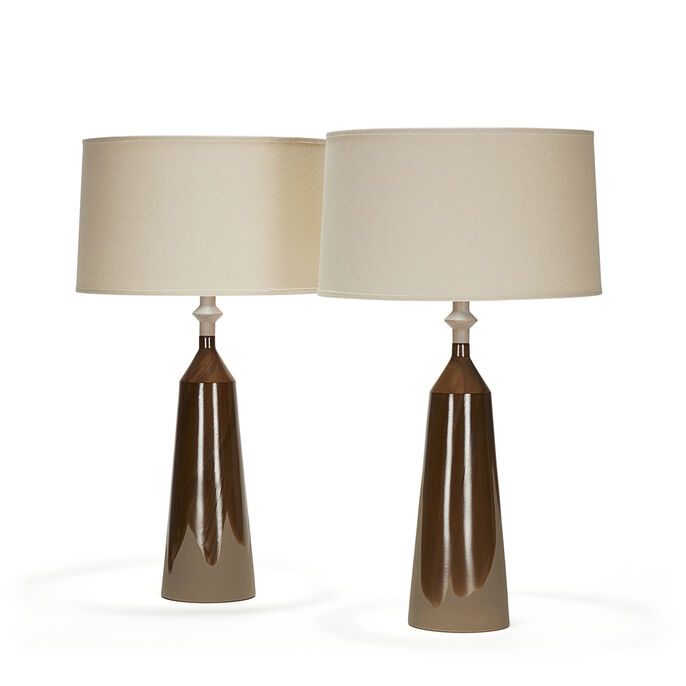 Pair of handmade stoneware ceramic table lamps in a gloss tobacco drape over brown matte glaze, with polished gunmetal sockets, driftwood-finished white oak necks and natural canvas shades.