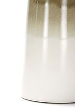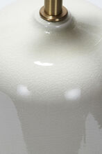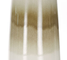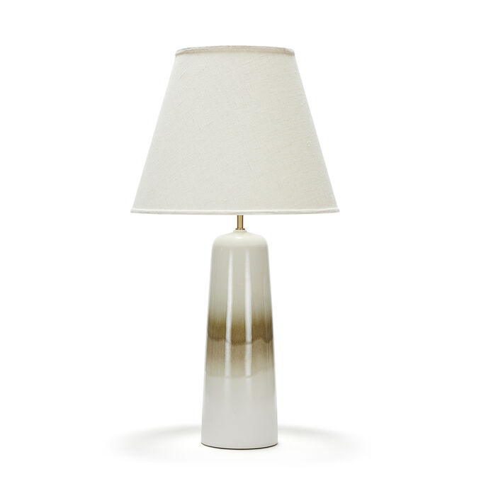 We create our ombre finishes by layering multiple mineral glazes and firing the stoneware ceramic several times to achieve the desired color fields and glaze movement. This table lamp comes with hand-finished Satin Brass hardware and Belgian linen shade in Cream.