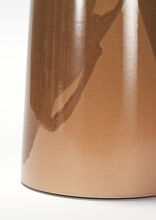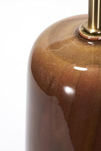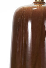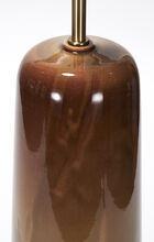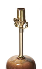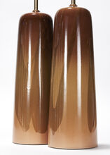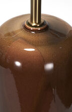 One-off pair of handcrafted stoneware ceramic table lamps in a positive-negative glaze study of coppers and browns. The lamps have hand-finished Satin Brass hardware and Belgian linen shade in Cream.