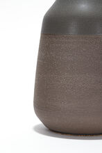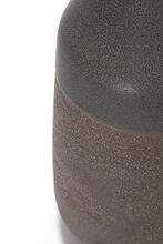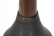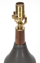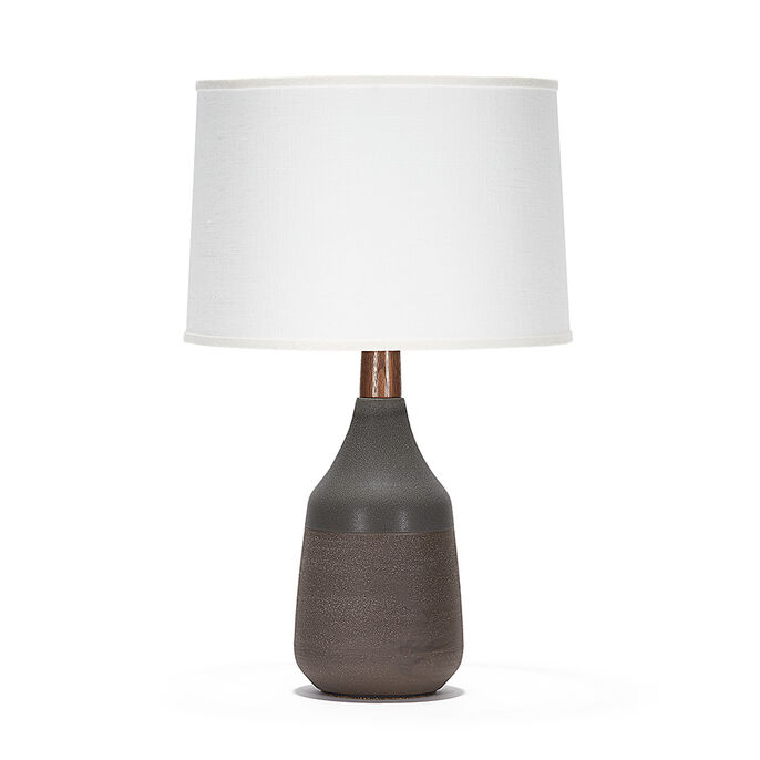 Handcrafted stoneware ceramic table lamp, the lower portion of the vessel with a rugged, carved Mesa finish in Otter, the top portion detailed in a smooth Charcoal glaze. Built with hand-finished Satin Brass hardware, solid Walnut neck and Belgian Linen shade in White.