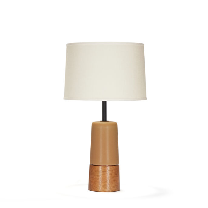 Handcrafted stoneware ceramic table lamp in custom Tan glaze, with solid White Oak base, hand-finished Blackened Brass hardware and Belgian Linen shade in Cream.