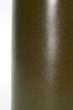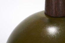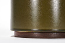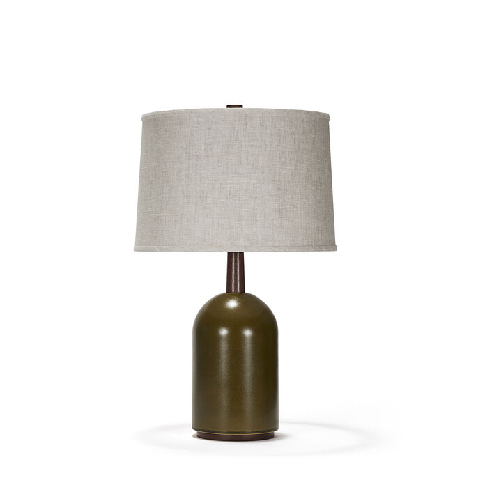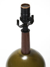 Handcrafted stoneware ceramic table lamp in a one-off custom Algae glaze with sheen. The lamp has solid Walnut details, hand-finished Blackened Brass hardware and Belgian Linen shade in Natural.