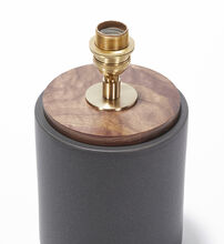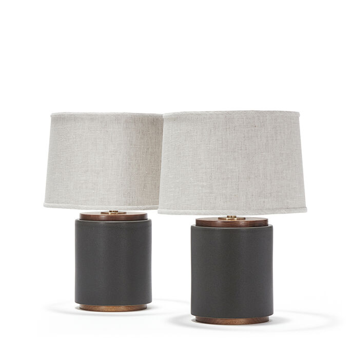 Pair of handcrafted stoneware ceramic table lamps in custom Graphite glaze, with Walnut caps and bases, hand-finished Satin Brass hardware and Belgian linen shades in Natural.