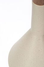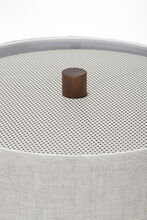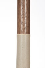 Pair of handcrafted stoneware ceramic table lamps in Mushroom glaze, with solid Walnut necks and finials, hand-finished Blackened Brass hardware, ceramic-coated perforated metal diffusers, and Belgian Linen shades in Natural.