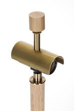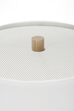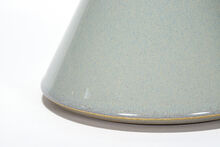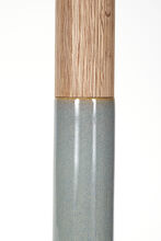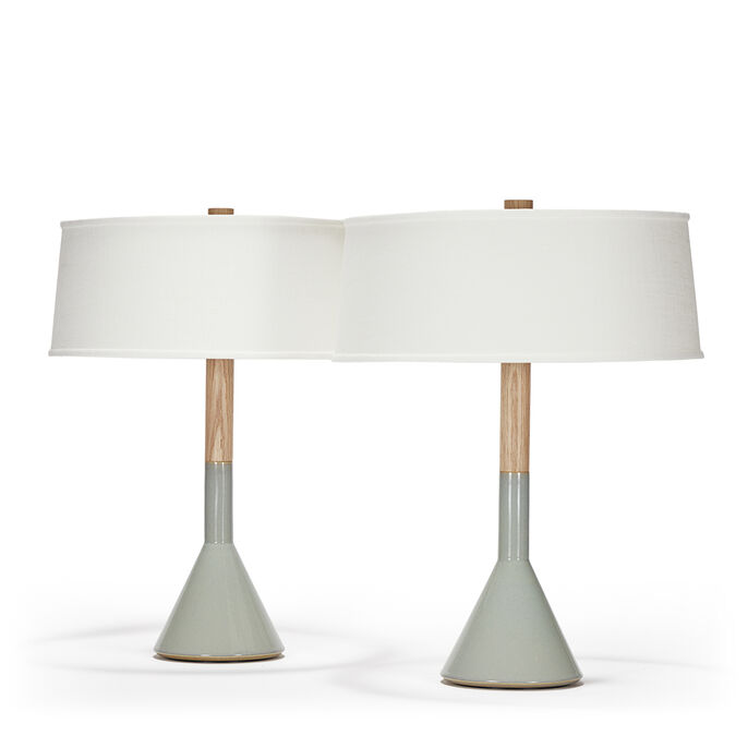Pair of handcrafted stoneware ceramic table lamps in Pigeon glaze, with White Oak necks and finials, hand-finished Satin Brass hardware, ceramic-coated perforated metal diffusers, and Belgian Linen shades in White.