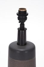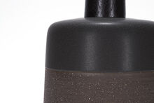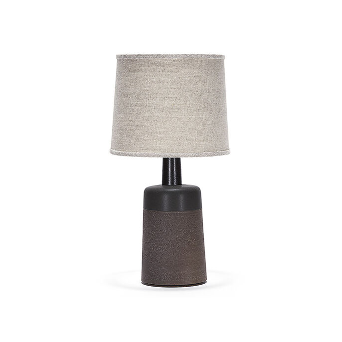 Handmade stoneware ceramic table lamp with rugged Mesa finish in Otter, the top portion of the vessel detailed in smooth Obsidian glaze. The lamp has hand-finished Blackened Brass hardware, an Ebonized Walnut neck and Belgian Linen shade in Natural.