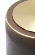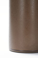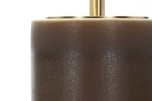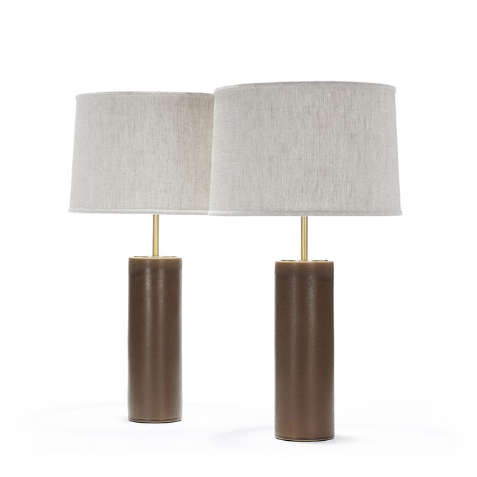 Pair of handcrafted stoneware ceramic table lamps in a one-off glaze we are calling Dark Leather, with hand-finished Satin Brass hardware and Belgian Linen shades in Natural.