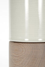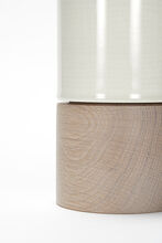Pair of handcrafted stoneware ceramic table lamps in a one-off custom banded glaze, with Driftwood-finished White Oak bases, hand-finished Blackened Brass hardware and Belgian Linen shades in Natural.