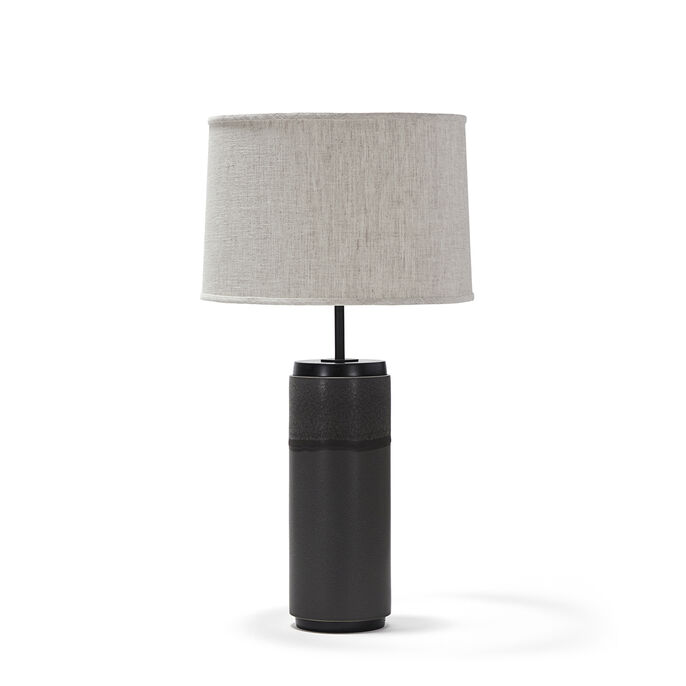 Handcrafted stoneware ceramic table lamp in Charcoal glaze, with Ebonized Walnut cap and base, hand-finished Blackened Brass hardware and Belgian linen shade in Natural.
