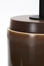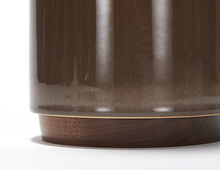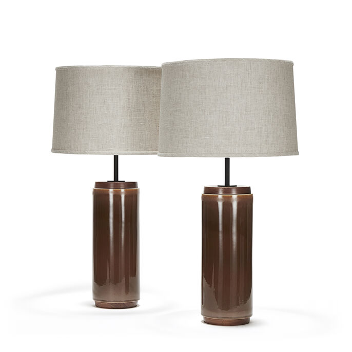 We create our ombre finishes by layering multiple mineral glazes and firing the stoneware ceramic several times to achieve varied color fields and glaze movement. Each piece is unique. This lamp pair is shown with hand-finished Blackened Brass hardware, Walnut caps and bases and Belgian Linen shades in Natural.