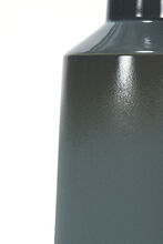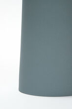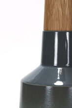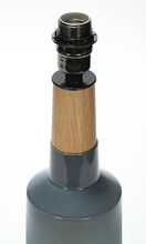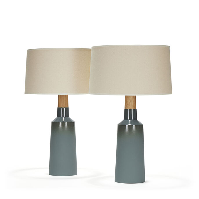 Pair of handmade stoneware ceramic table lamps in a custom Blue-Gray Fade glaze, with polished Gunmetal sockets, solid White Oak necks and Canvas shades.