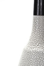 Pair of handcrafted stoneware ceramic table lamps in very limited edition Crawl glaze, with turned Ebonized Walnut necks and bases, hand-finished Blackened Brass hardware and White Linen shades. The pair is UL listed and comes with brown cloth-covered cords.