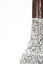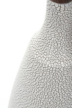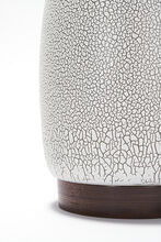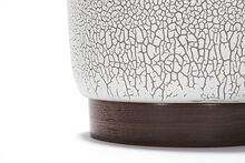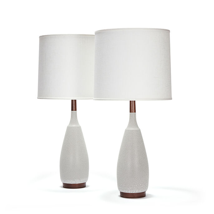Pair of handcrafted stoneware ceramic table lamps in a limited-edition Crawl glaze, with turned Walnut necks and bases, hand-finished Satin Brass hardware and Belgian Linen shades in White.