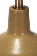 Handcrafted stoneware ceramic table lamp in pale Warbler Egg glaze, with hand-finished Satin Brass hardware and Belgian Linen shade in Cream.