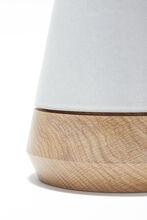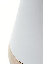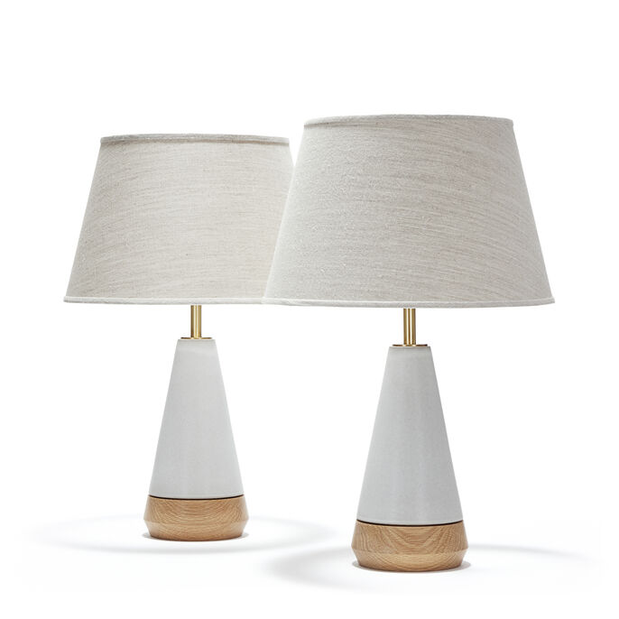 Pair of handcrafted stoneware ceramic table lamps in Fossil Gray glaze, with solid White Oak bases, hand-finished Satin Brass hardware and Belgian Linen shades in Natural.