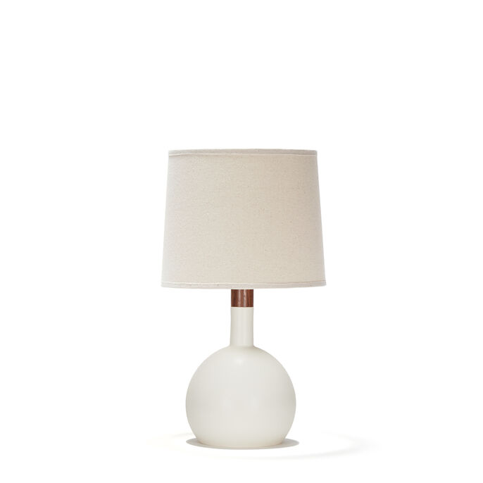 Handmade stoneware ceramic table lamp in White Quartz glaze, with polished gunmetal socket, solid walnut neck and handmade canvas shade.