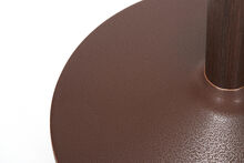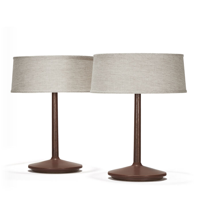 Pair of handcrafted stoneware ceramic table lamps in a one-off brown satin glaze, with turned Walnut necks, hand-finished Satin Brass hardware, Belgian Linen shades in Natural and perforated metal diffusers.