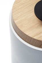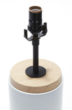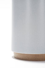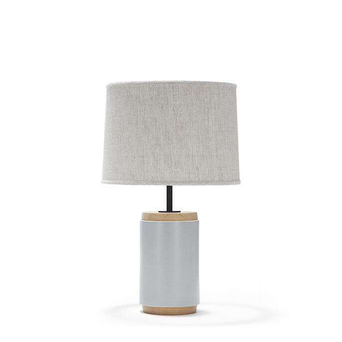 Handcrafted stoneware ceramic table lamp in Northern Sky glaze, with White Oak cap and base, hand-finished Blackened Brass hardware and Belgian Linen shade in Natural.