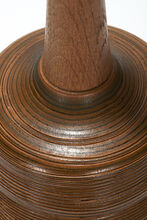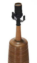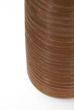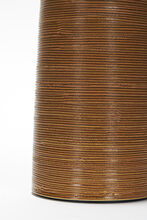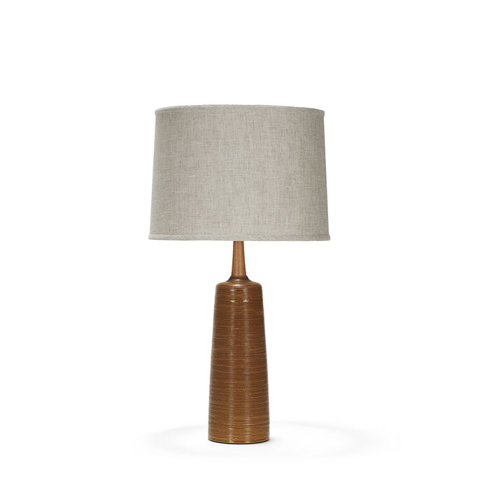 Handcrafted stoneware ceramic table lamp in Ochre glaze over furrowed clay, the finish resembling coiled twine. The lamp has a solid White Oak neck, hand-finished Blackened Brass hardware and Belgian Linen shade in Natural.
