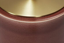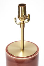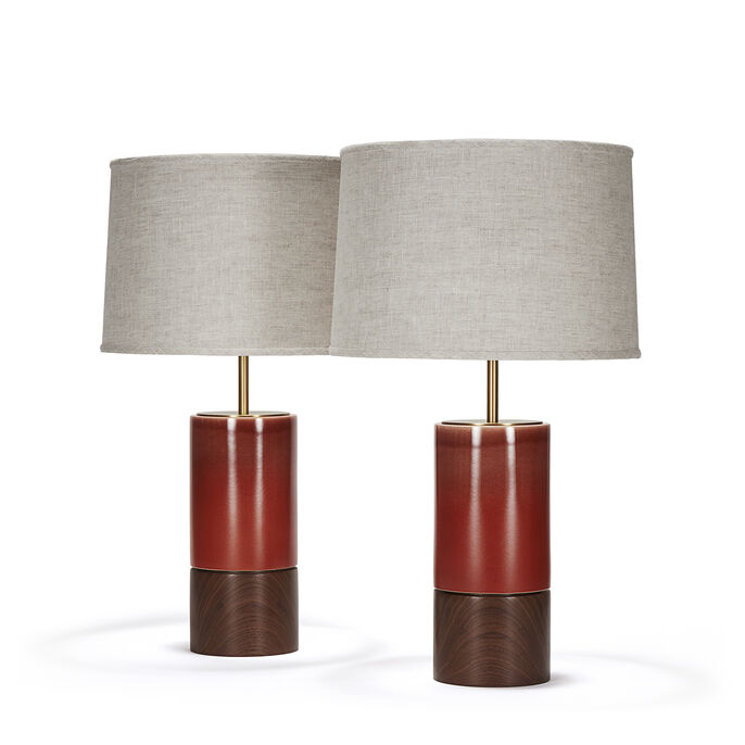 Pair of handcrafted stoneware ceramic table lamps in Red Rock glaze, with solid Walnut bases, hand-finished Satin Brass hardware and Belgian Linen shades in Natural.