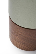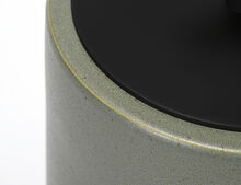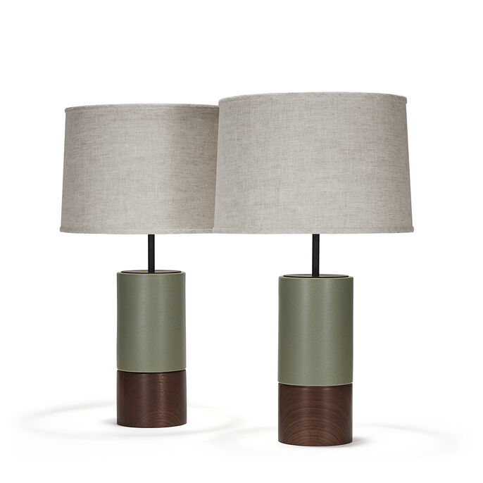 Pair of handcrafted stoneware ceramic table lamps in Sedum, a satin speckle glaze, with solid Walnut bases, hand-finished Blackened Brass hardware and Belgian Linen shades in Natural. Available with or without diffusers.