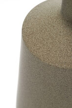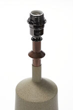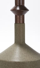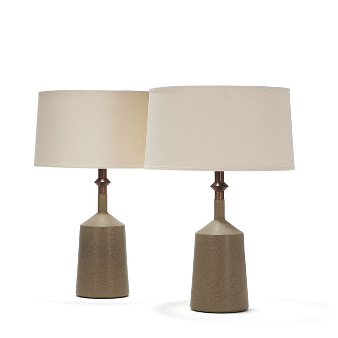 Pair of handmade stoneware ceramic table lamps in Foundry glaze, with polished gunmetal sockets, walnut necks and canvas shades.