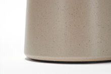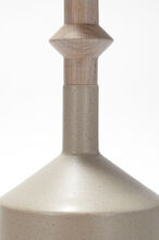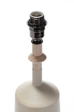 Pair of handmade stoneware ceramic table lamps in Mushroom glaze, with polished gunmetal sockets, driftwood-finished white oak necks and canvas shades.