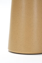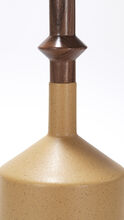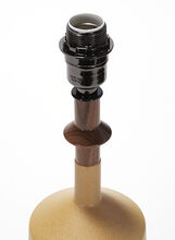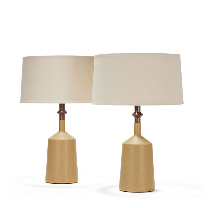 Pair of handmade stoneware ceramic table lamps in Yellow Moth glaze, with polished gunmetal sockets, walnut necks and canvas shades.