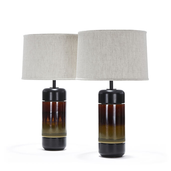 Pair of handcrafted stoneware ceramic table lamps in a custom Drape glaze, with Ebonized Walnut caps and bases, hand-finished Blackened Brass hardware and Belgian Linen shades in Natural.