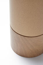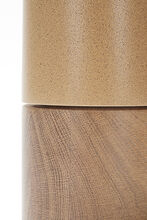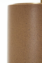 Pair of handcrafted stoneware ceramic table lamps in Hen's Egg glaze, with solid White Oak bases, hand-finished Satin Brass hardware and Belgian Linen shades in Cream.