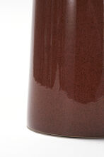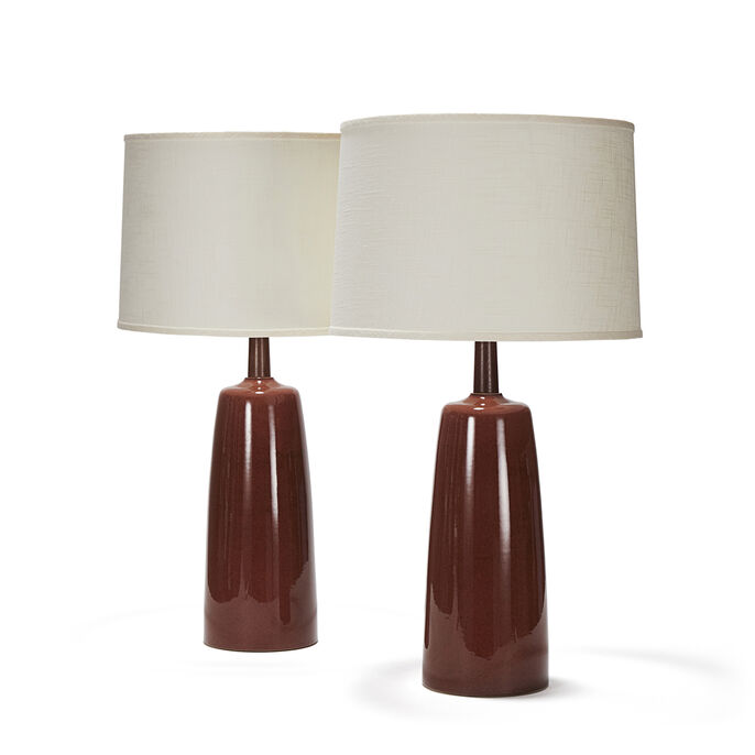 Pair of handcrafted stoneware ceramic table lamps in Pomegranate glaze, with solid Walnut necks, hand-finished Satin Brass hardware and Belgian Linen shades in Cream.