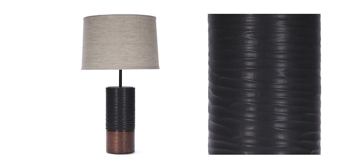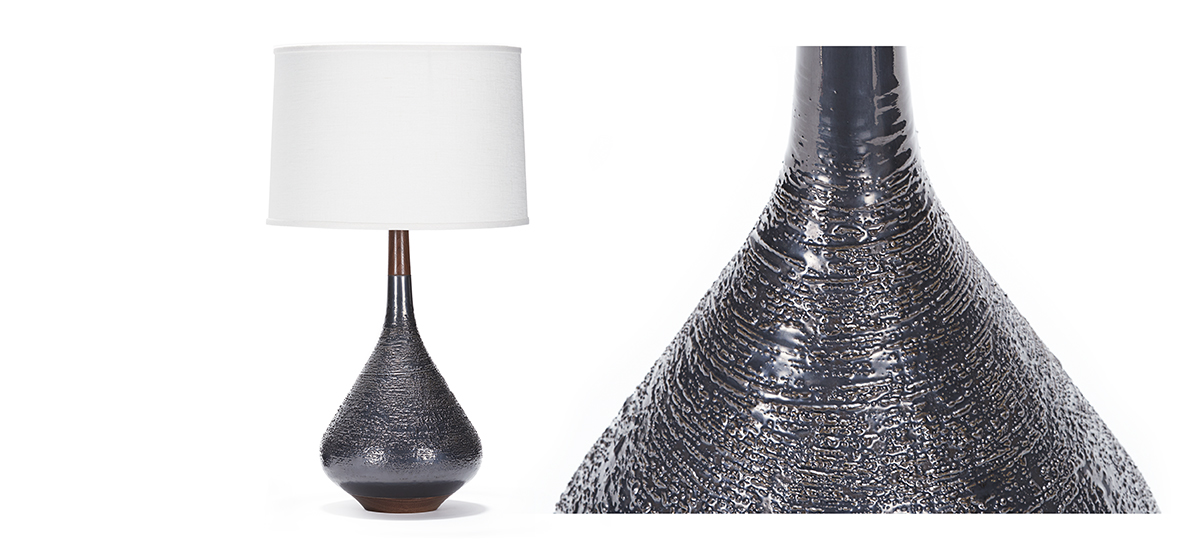 We carve horizontal radial markings on our Canyon lamp bodies while the clay is soft. We then finish each vessel in Obsidian glaze, which has a velvety surface and a subtle sheen.