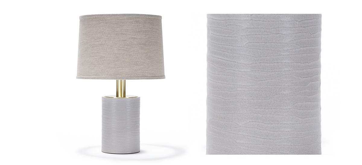 As with our Canyon finish, we hand carve horizontal radial markings around each Pale Canyon lamp body while the clay is soft. After bisque firing, we then apply multiple layers of Fossil Gray glaze over the vessels. As the glaze reaches full temperature in the kiln, it yields slightly on the higher ridges, resulting in an organic linear pattern.