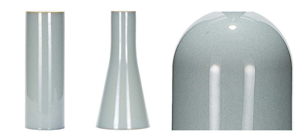 Pigeon is a plush celadon/gray-blue with a glossy surface. The top break on cylindrical forms and the base of some vessel forms can take on a warm honey color before easing into the celadon of the main body. Each firing offers varying nuanced details, from solid color to light speckling.